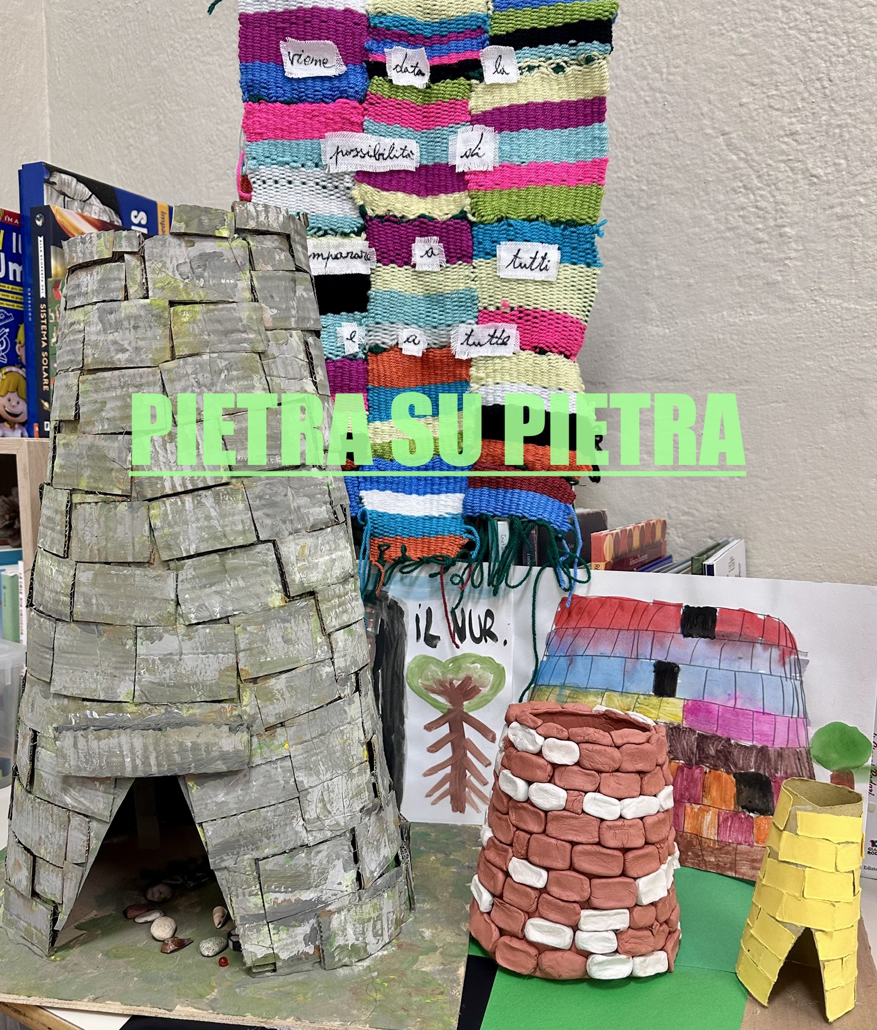 Il nuraghe moderno, realizzato con una tecnica mista basata su collage materico, utilizza materiali di riciclo come cartone proveniente da scatole della pizza, conchiglie, vetri colorati e piccoli oggetti recuperati. All’interno della struttura sono stati posizionati 22 elementi, ognuno dei quali rappresenta una pietra simbolica. Queste pietre contemporanee testimoniano la forza interiore di ogni bambina e ogni bambino della classe: così come i nuraghi del passato sono stati costruiti pietra su pietra, attraverso scelte attente e materiali capaci di durare, anche le persone della classe costruiscono la propria crescita con determinazione, impegno e capacità di superare ostacoli grandi o piccoli. L’opera è accompagnata da un video, in cui ogni bambina e ogni bambino racconta con la propria voce il sogno che desidera realizzare o la paura che sta imparando a superare. Le parole si intrecciano con le immagini dei due nuraghi e dei materiali utilizzati, creando un racconto corale in cui tradizione e presente dialogano, e in cui ogni voce trova spazio e valore. Il progetto valorizza il patrimonio culturale sardo, promuove la sostenibilità attraverso il riuso creativo dei materiali e invita la classe a riflettere sul tema della resilienza individuale e collettiva. L’opera finale è un nuraghe moderno costruito con sogni, emozioni e determinazione: un monumento simbolico che dimostra come, insieme, sia possibile creare una comunità solida, inclusiva e capace di affrontare il futuro con speranza.