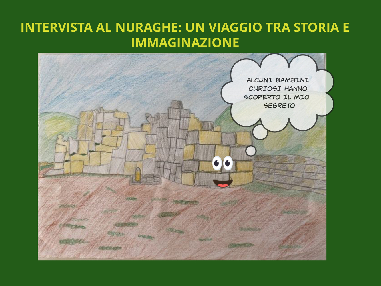 Partendo dalla visita guidata delnuraghe Palmavera, durante la quale i bambini hanno posto domande all’archeologa che ci ha accompagnato nella visita, abbiamo sviluppato un’attività creativa e originale: immaginare che fosse il nuraghe stesso a rispondere alle domande dei bambini, dando voce al monumento.