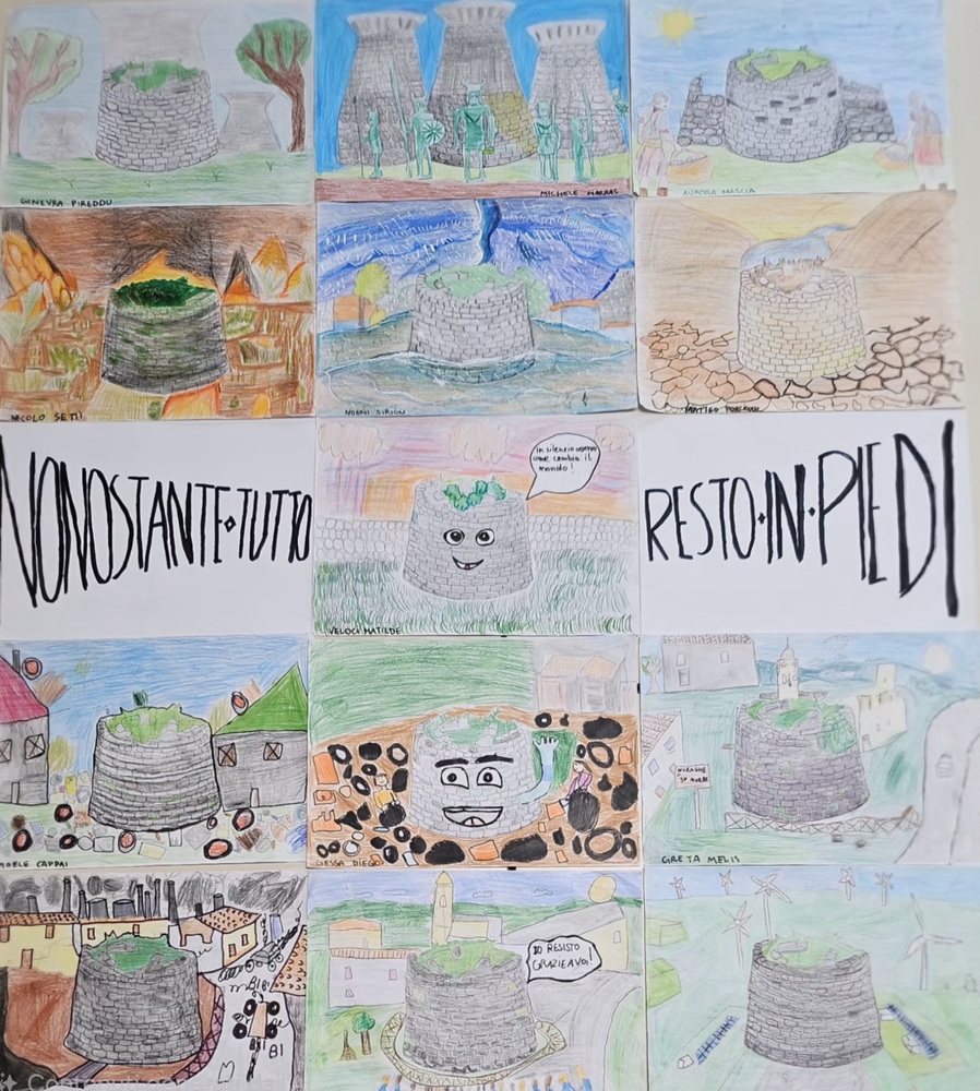 Il nuraghe "Su Nuraxi" di Siurgus Donigala viene rappresentato, dagli alunni della classe Terza di Scuola Primaria, con dei disegni in successione temporale che hanno, al centro dell'immagine, sempre il nuraghe del loro paese allo stato attuale.