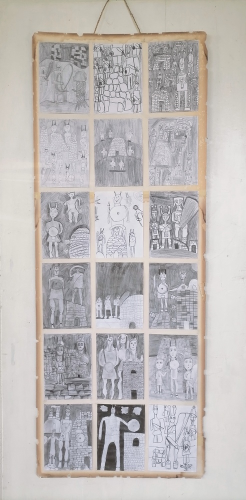 Frutto della fantasia degli alunni per la quale i Giganti sono immaginati non dissimili ai Robot dell’animazione giapponese (Mazinga, Jeeg, Goldrake etc.), le immagini in bianco e nero, nel loro stile così primitivo ed infantile, al di là degli intenti dei ragazzi, ci parlano di quella forza originaria del segno grafico propria dei bambini, e su cui artisti come Pablo Picasso lavorarono per buona parte della loro vita. Al di là della fascinazione per l’animazione giapponese, che finisce quasi per scomparire, travolta dall’essenzialità espressiva dei disegni, questo stendardo, in ogni suo disegno, ci ricorda invece quella “costante resistenziale sarda” di cui parla Giovanni Lilliu, per la quale, l’arte sarda, nella sua espressività primitiva ed originaria, ha resistito per secoli e secoli a tutte le dominazioni artistiche e culturali dei differenti conquistatori dell’isola.