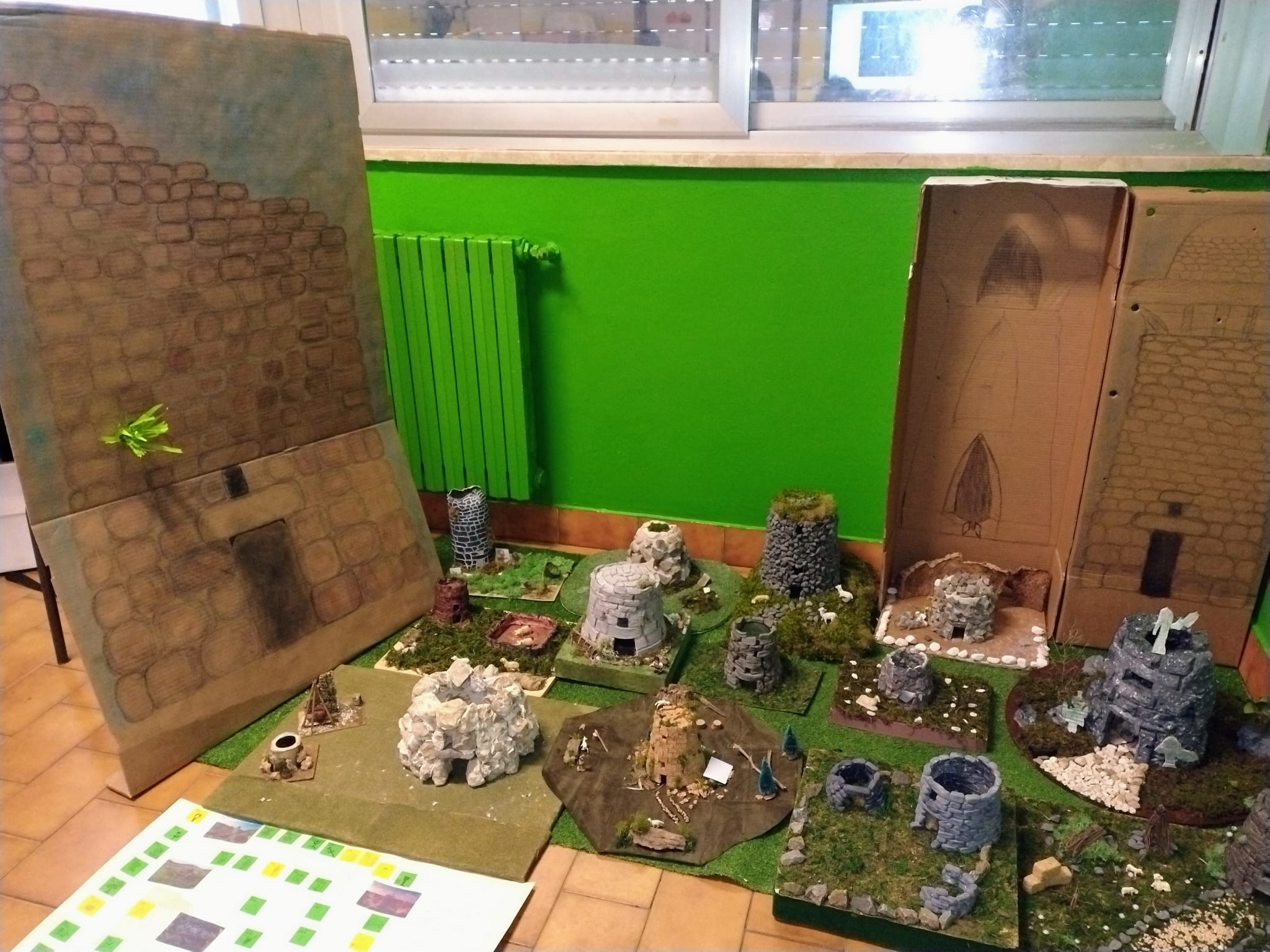 Dopo avere affrontato i concetti di “vulnerabilità dei monumenti” e di “resilienza”, con pazienza abbiamo iniziato a modellare argilla, das, a sovrapporre pietre, a tagliare polistirolo, poliuretano espanso, cartone e perfino sughero! Poi abbiamo aggiunto erbetta, muschio e legnetti per provare a creare un’ambientazione naturale adeguato.